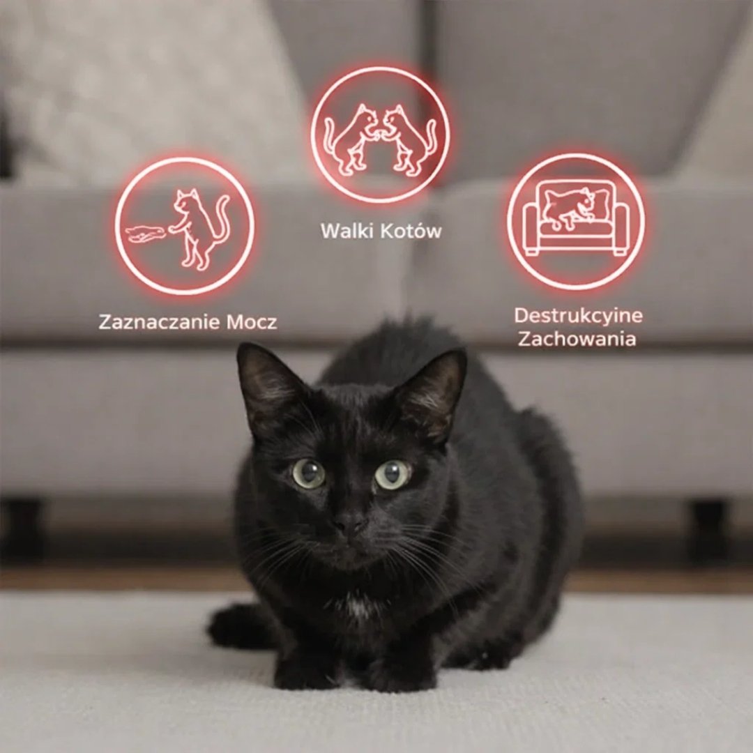Naśladuje naturalne sygnały, których kotki używają, aby uspokoić swoje kocięta. Redukuje stres i napięcie w domu.